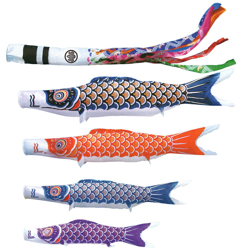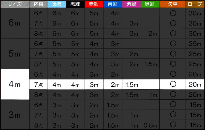 セット内容:吹流4m 黒鯉4m 赤鯉3m 青鯉2m 紫鯉1.5m 矢車 ロープ20m