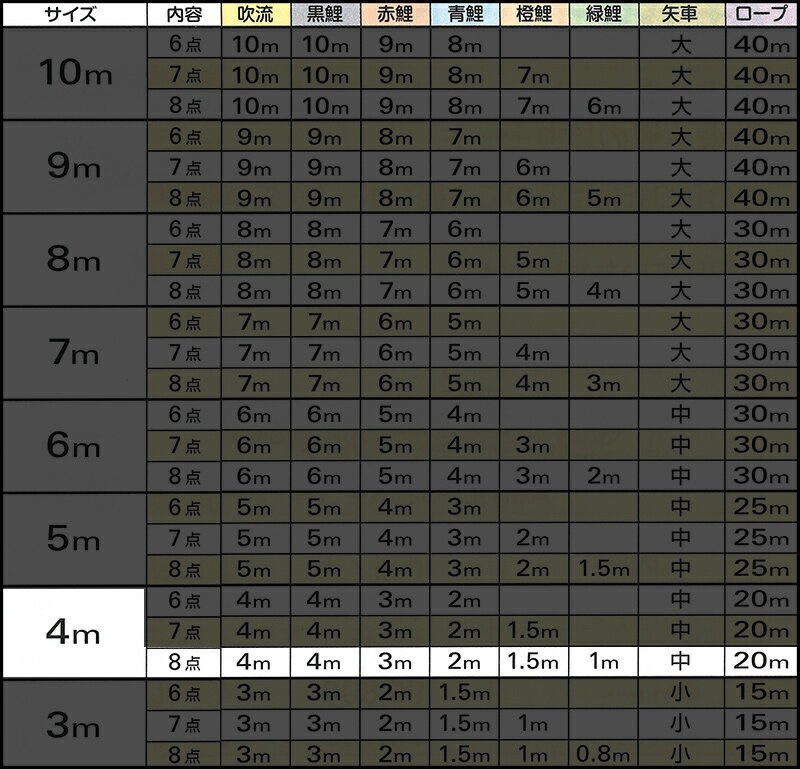 セット内容:吹流4m 黒鯉4m 赤鯉3m 青鯉2m 橙鯉1.5m 緑鯉1m 矢車 ロープ20m
