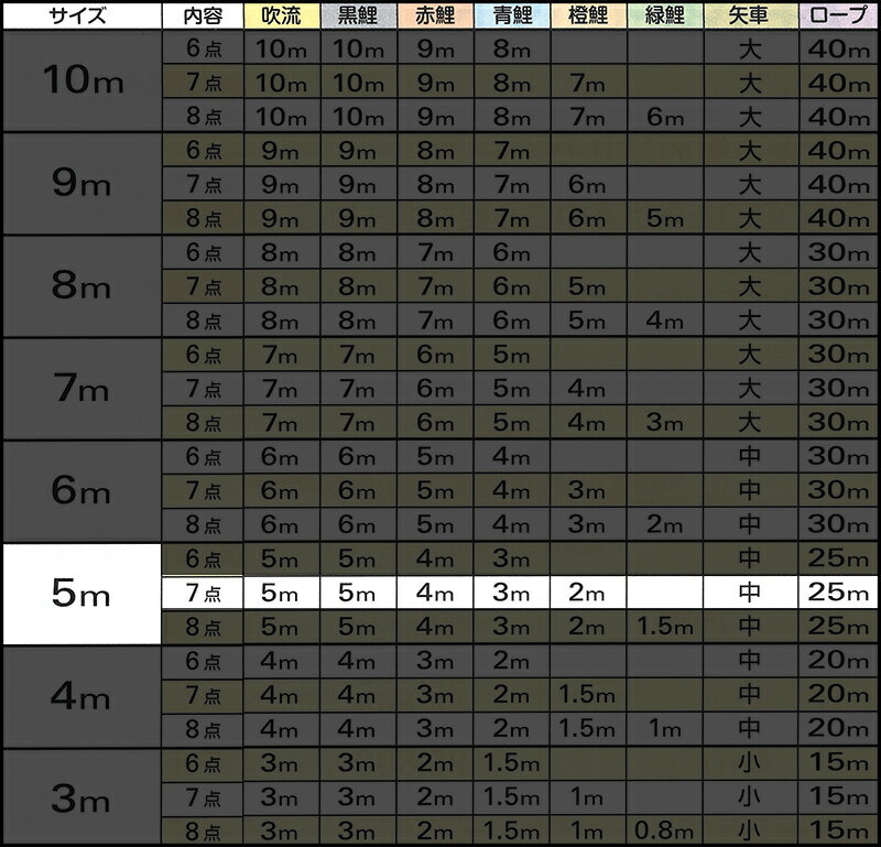 セット内容:吹流5m 黒鯉5m 赤鯉4m 青鯉3m 橙鯉2m 矢車 ロープ25m