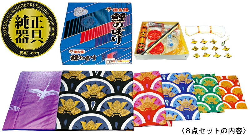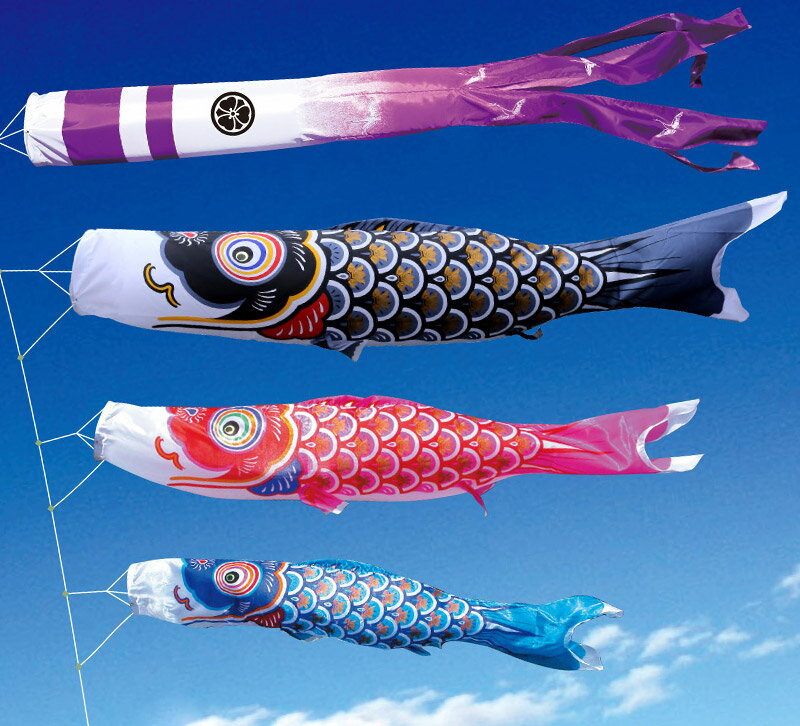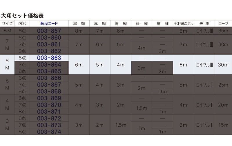 セット内容:黒鯉6m 赤鯉5m 青鯉4m 千羽鶴吹流し6m 矢車(矢羽根直径)75cm ロープ30m