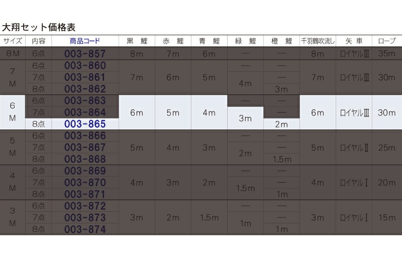 セット内容:黒鯉6m 赤鯉5m 青鯉4m 緑鯉3m 橙鯉2m 千羽鶴吹流し6m 矢車(矢羽根直径)75cm ロープ30m
