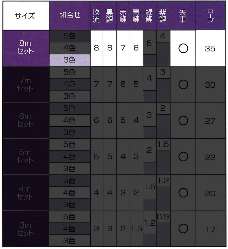 セット内容:吹流し8m 黒鯉8m 赤鯉7m 青鯉6m 矢車0.69m ロープ35m