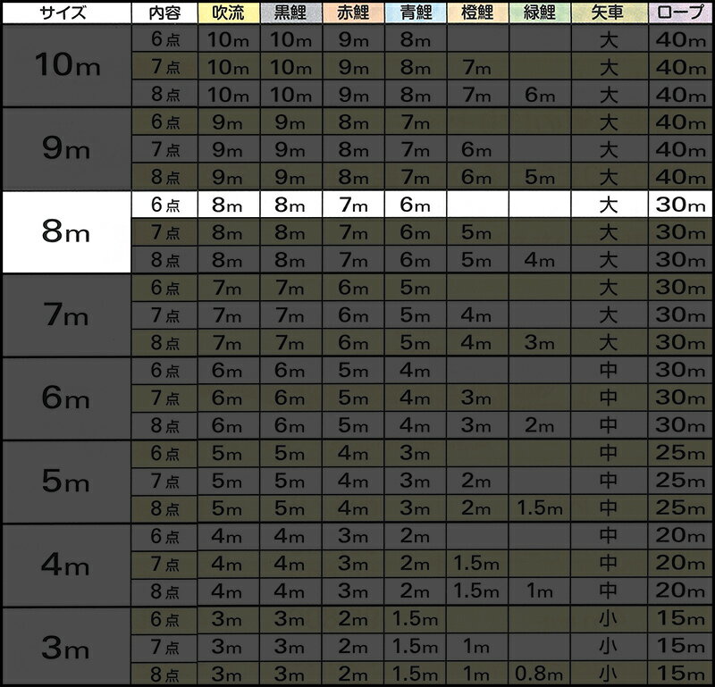 セット内容:吹流8m 黒鯉8m 赤鯉7m 青鯉6m 矢車 ロープ30m