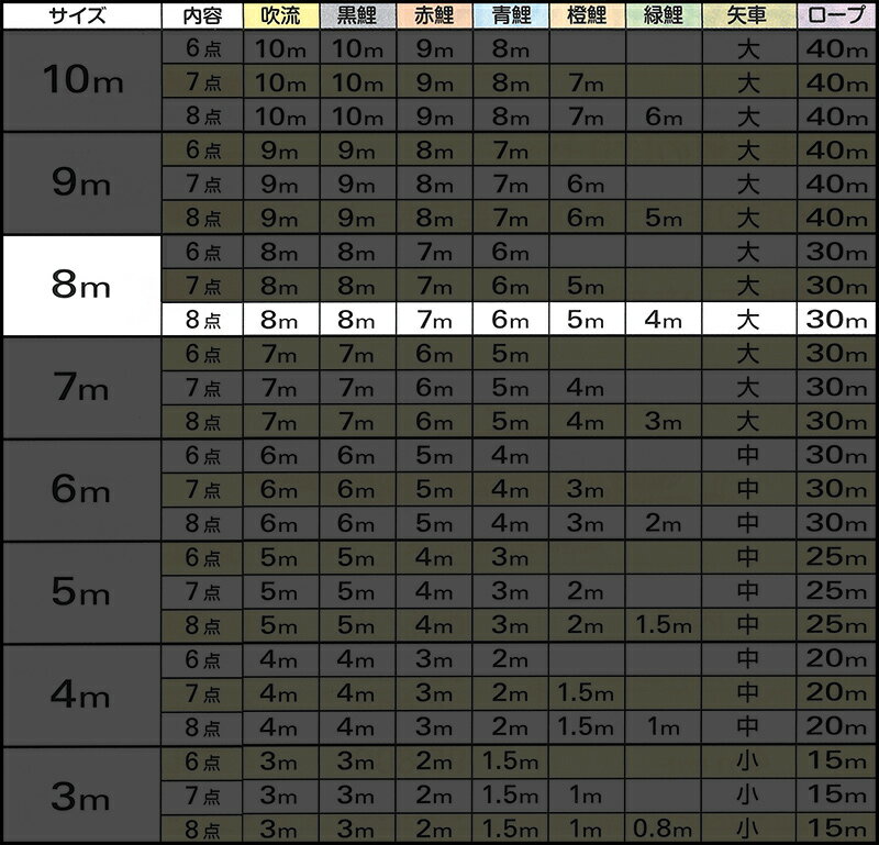 セット内容:吹流8m 黒鯉8m 赤鯉7m 青鯉6m 橙鯉5m 緑鯉4m 矢車 ロープ30m