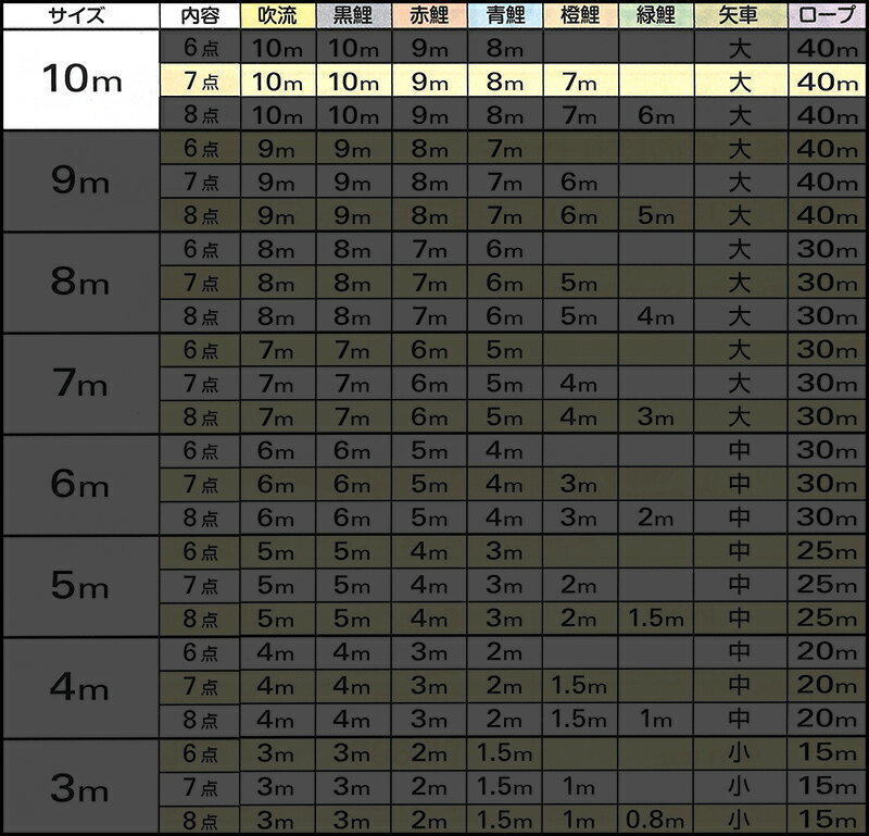 セット内容:吹流10m 黒鯉10m 赤鯉9m 青鯉8m 橙鯉7m 矢車 ロープ40m