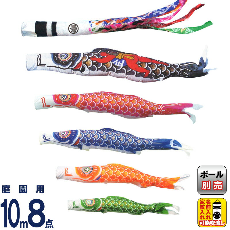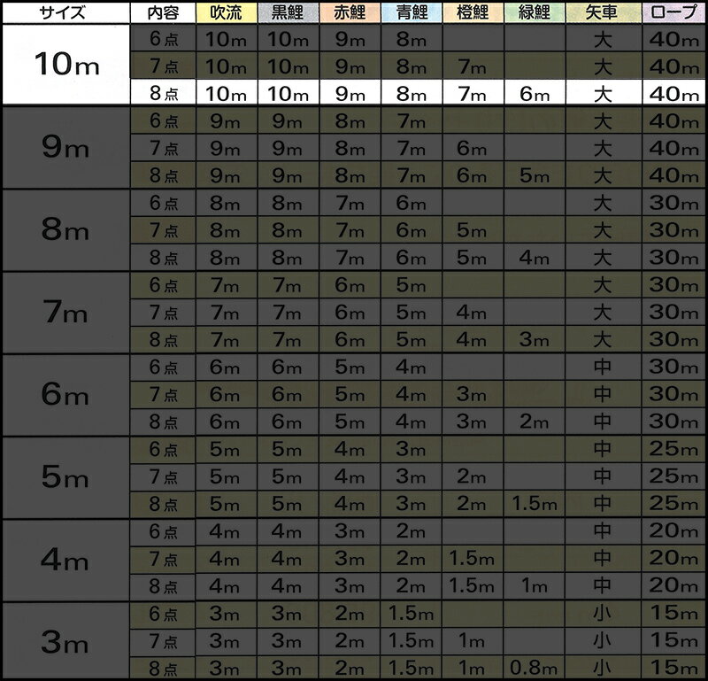 セット内容:吹流10m 黒鯉10m 赤鯉9m 青鯉8m 橙鯉7m 緑鯉6m 矢車 ロープ40m