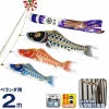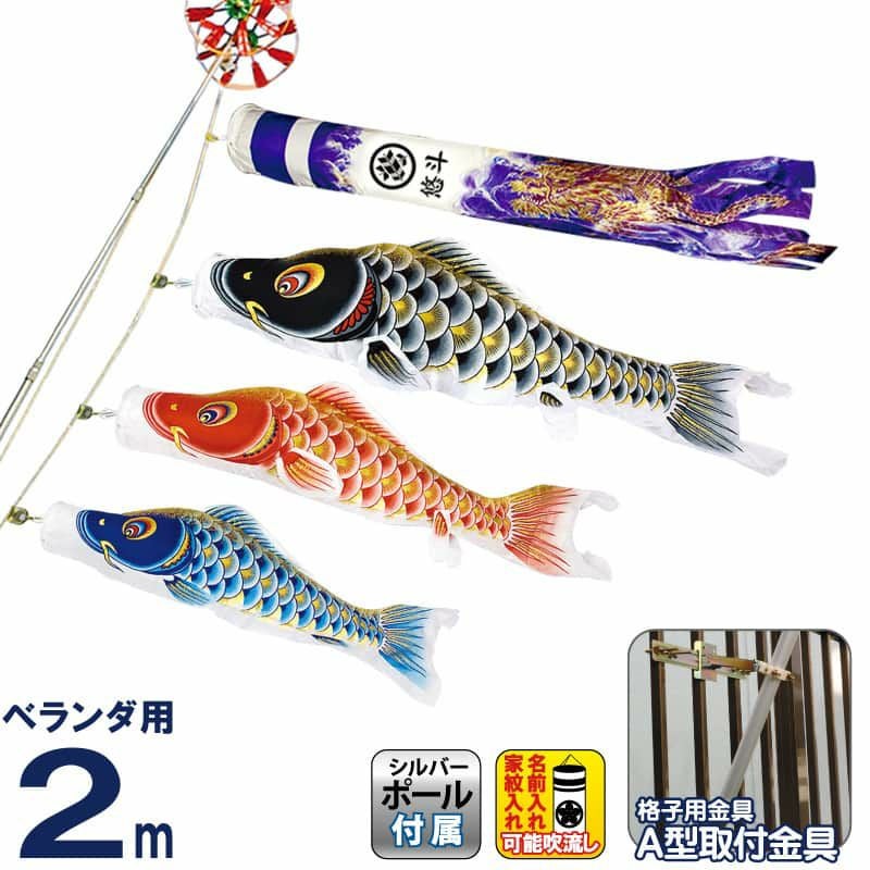 セット内容:吹流し2m 黒鯉2m 赤鯉1.5m 青鯉1.2m スカイリー矢車 A型取付金具 シルバーポール20号(2.3m) ロープ