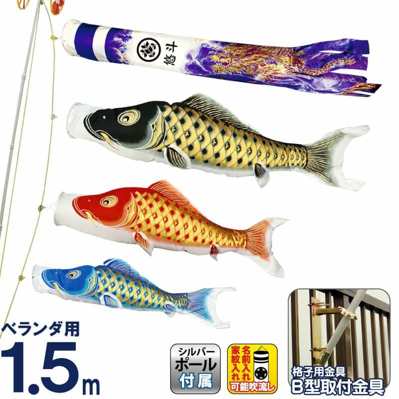 【送料無料】最安値に挑戦!2026年度新作 鯉のぼり こいのぼり 村上鯉 鯉のぼり ベランダ用 スタンダードホームセット 1.5m 黄金輝 紫龍吹流し 撥水 家紋・名入れ可 【2026年度新作】 mk-651-737