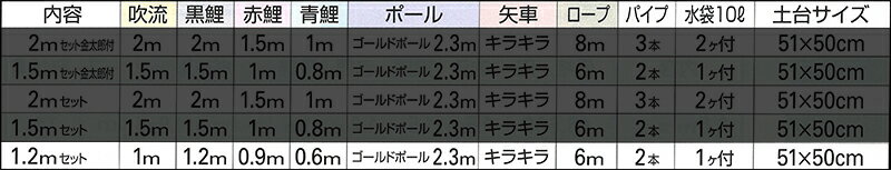 セット内容:吹流1m 黒鯉1.2m 赤鯉0.9m 青鯉0.6m ゴールドポール2.3m キラキラ矢車 ロープ6m パイプ2本 水袋10L×1ヶ 土台サイズ51×50cm