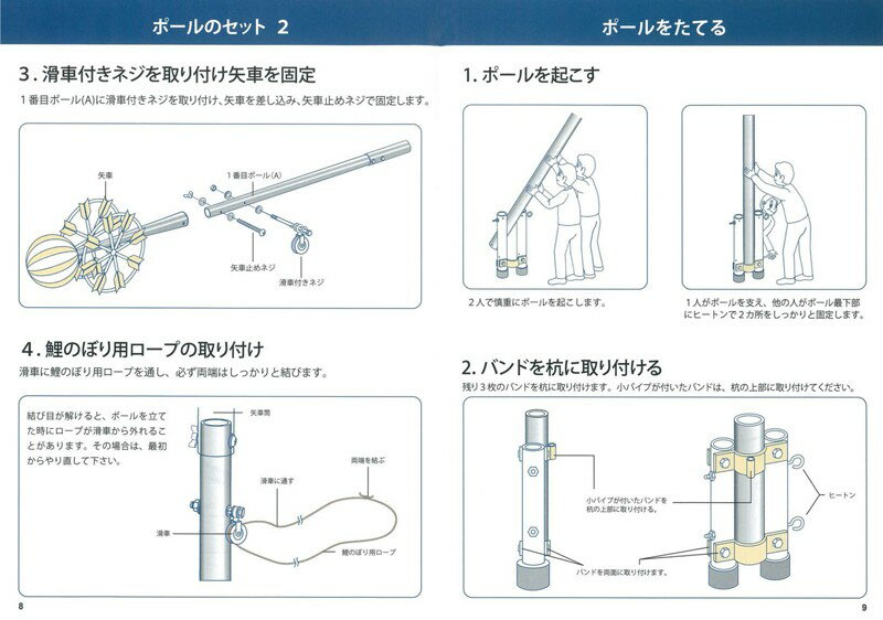 安全のためポールが倒れないように固定する補助ロープがなくても、安全な設計になっています。これにより補助ロープに鯉のぼりがからみやすかった点を解消できました。