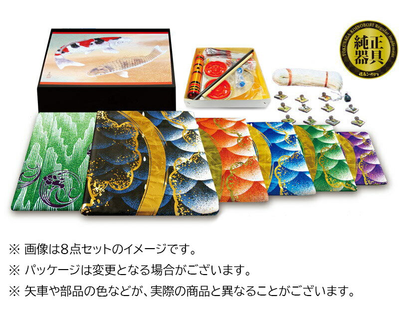 こちらの商品は8点セットとなります。鯉は黒鯉、赤鯉、青鯉、緑鯉、紫鯉の5点となりますので、ご確認くださいませ。