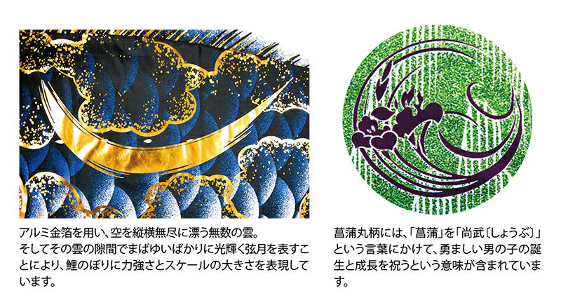 鯉のぼりには豪華絢爛なアルミ金箔を用い、雲の隙間に光り輝く弦月を描くことで、力強さとスケールの大きさを表現しました。吹流しは深緑を基調とした色に、端午の節句にゆかりの深い“菖蒲丸柄”を散りばめることでお子様の誕生祝い、健やかな成長を願うという意味が込められています。