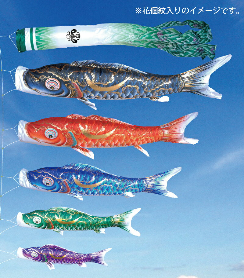 セット内容:黒鯉5m 赤鯉4m 青鯉3m 緑鯉2m 紫鯉1.5m 尚武之丸吹流し5m 矢車(矢羽根直径)60cm ロープ25m
