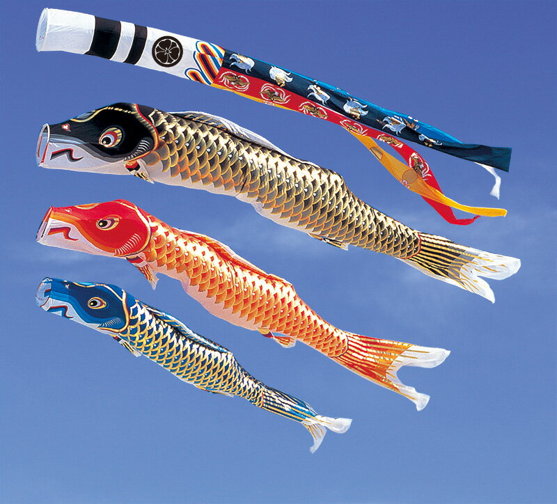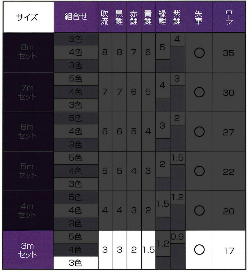 セット内容:吹流し3m 黒鯉3m 赤鯉2m 青鯉1.5m 矢車0.45m ロープ17m