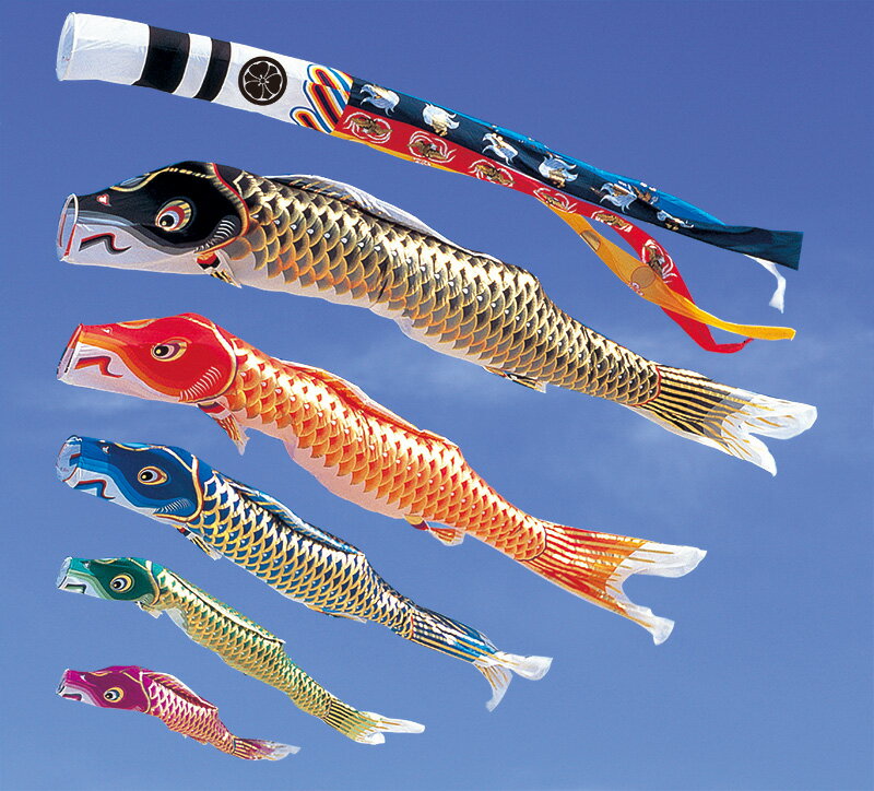 セット内容:吹流し3m 黒鯉3m 赤鯉2m 青鯉1.5m 緑鯉1.2m 紫鯉0.9m 矢車0.45m ロープ17m