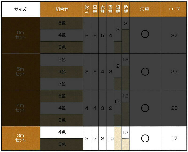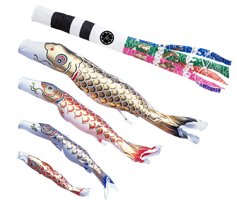 セット内容:吹流し3m 黒鯉3m 赤鯉2m 青鯉1.5m 橙鯉1.2m 矢車0.45m ロープ17m