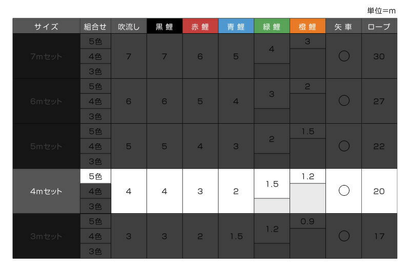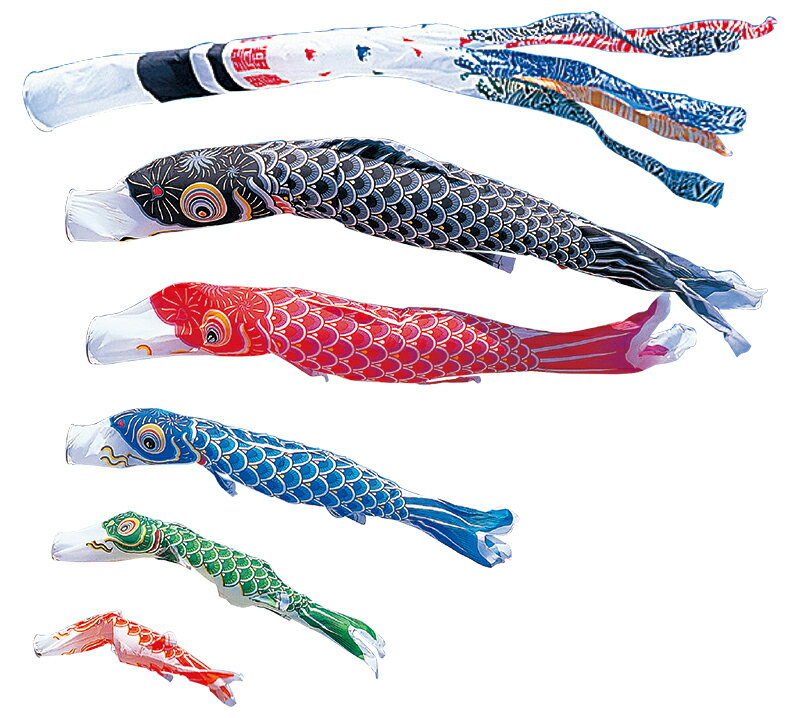 セット内容:吹流し4m 黒鯉4m 赤鯉3m 青鯉2m 緑鯉1.5m 橙鯉1.2m 矢車0.55m ロープ20m