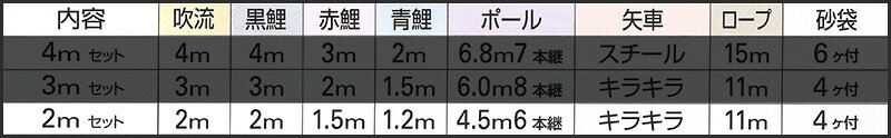 セット内容:吹流2m 黒鯉2m 赤鯉1.5m 青鯉1.2m ポール4.5m6本継 キラキラ矢車 ロープ11m 砂袋4ヶ付