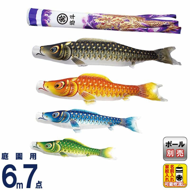 【送料無料】最安値に挑戦!2024年度新作 鯉のぼり こいのぼり 村上鯉 鯉のぼり 庭園用 6m 7点セット 金彩ロマン 紫龍吹流し 撥水 家紋・名入れ可 【2024年度新作】 mk-109-405