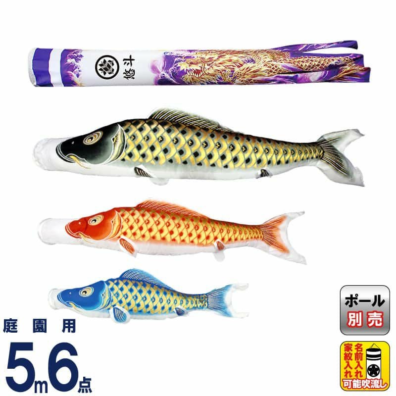 【送料無料】最安値に挑戦!2024年度新作 鯉のぼり こいのぼり 村上鯉 鯉のぼり 庭園用 5m 6点セット 黄金輝 紫龍吹流し 撥水 家紋・名入れ可 【2024年度新作】 mk-651-577