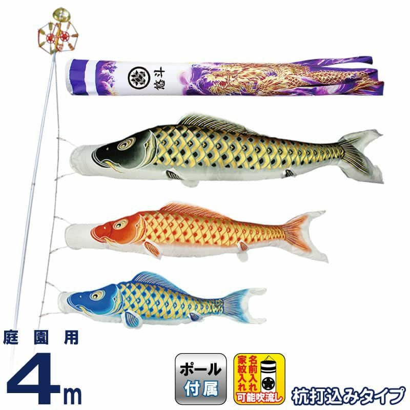 【送料無料】最安値に挑戦!2024年度新作 鯉のぼり こいのぼり 村上鯉 鯉のぼり 庭園用 4m ガーデンセット 杭打込 黄金輝 紫龍吹流し 撥水 家紋・名入れ可 【2024年度新作】 mk-651-669