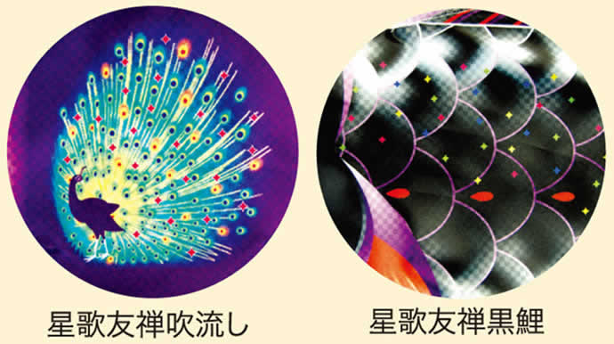 なめらかなグラーデーションを基調とした彩り豊かな鯉のぼりに、孔雀をイメージした色彩鮮やかな吹流し、染めの発色良いポリエステルサテン生地が豪華絢爛に演出します。