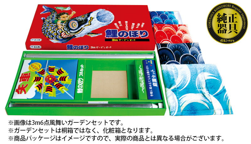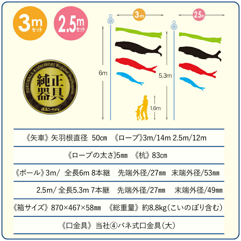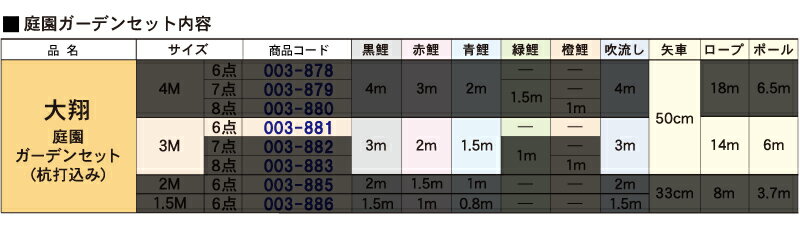 ポール全長:6m 8本継 セット内容:黒鯉3m 赤鯉2m 青鯉1.5m 吹流し3m 矢車(矢羽根直径)50cm ロープ14m ポール6m 杭(83cm)