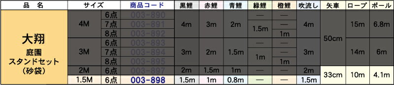 ポール全長:4.1m 5本継 スタンド設置面:620×630mm セット内容:黒鯉1.5m 赤鯉1m 青鯉0.8m 吹流し1.5m 矢車(矢羽根直径)33cm ロープ10m ポール4.1m スタンド 砂袋