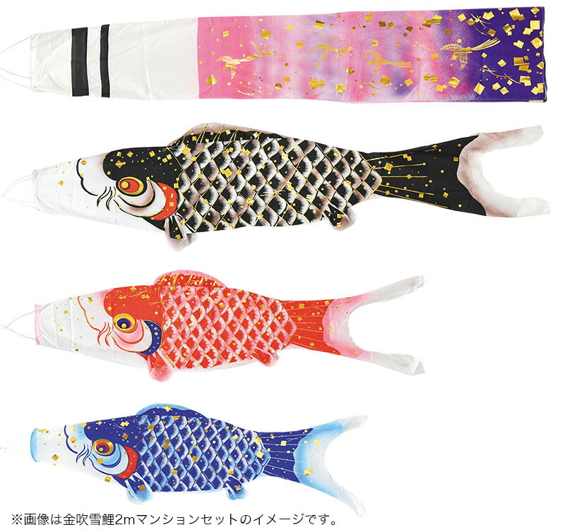 セット内容:黒鯉2m 赤鯉1.5m 青鯉1.1m 吹流し2m 矢車 ロープ 滑車 口金 伸縮ゴールドポール2.3m 5本継 取付金具(格子タイプ)