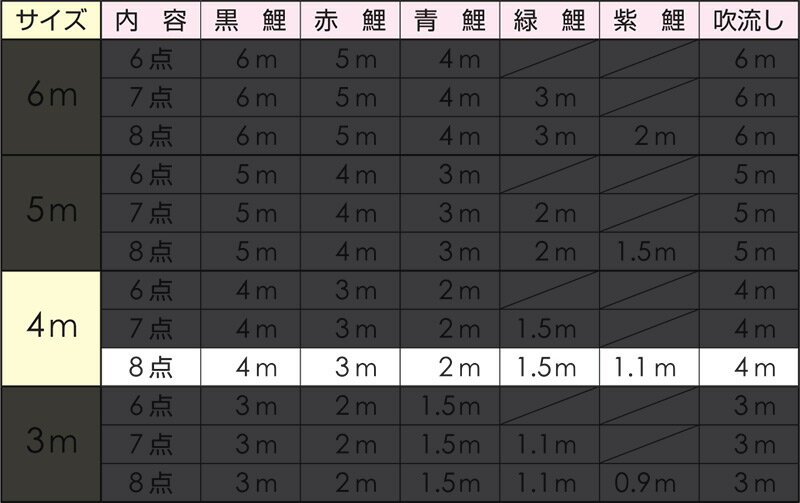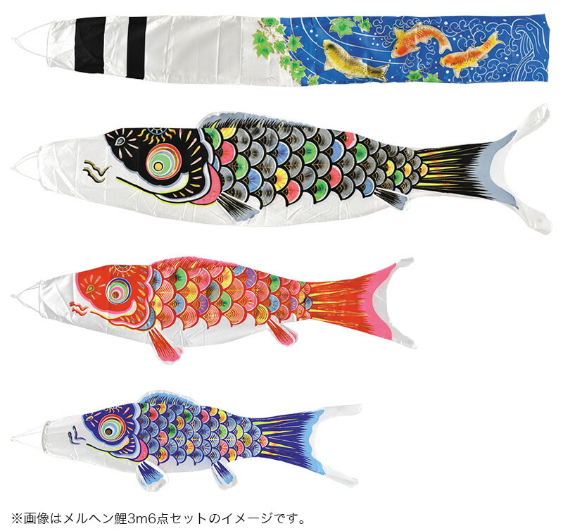 セット内容:黒鯉4m 赤鯉3m 青鯉2m 緑鯉1.5m 紫鯉1.1m 吹流し4m 矢車 ロープ