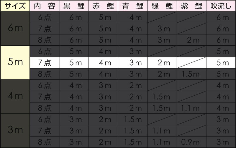 セット内容:黒鯉5m 赤鯉4m 青鯉3m 緑鯉2m 吹流し5m 矢車 ロープ