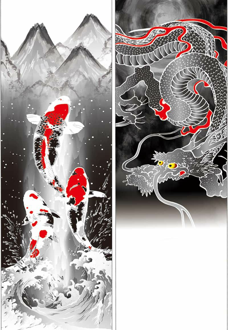 黒と赤を基調に描かれた鯉や龍は躍動感があり、力強さを感じさせる仕上がりですね。