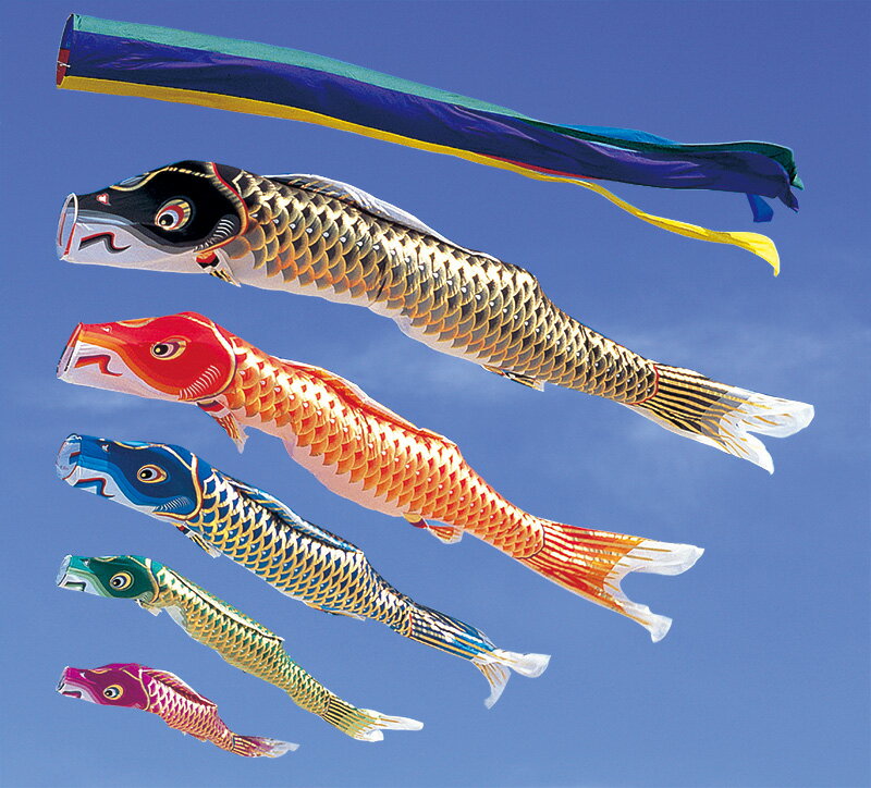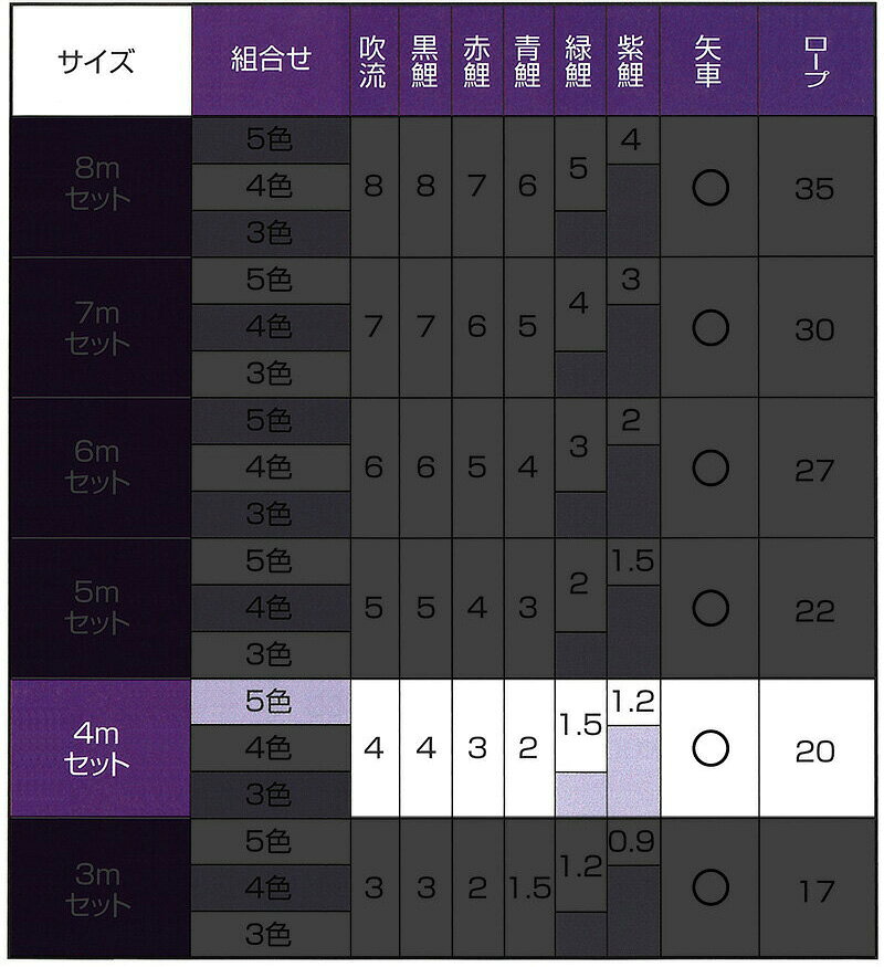 セット内容:吹流し4m 黒鯉4m 赤鯉3m 青鯉2m 緑鯉1.5m 紫鯉1.2m 矢車0.55m ロープ20m