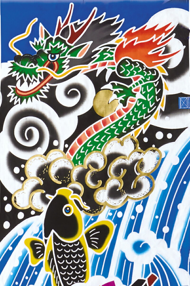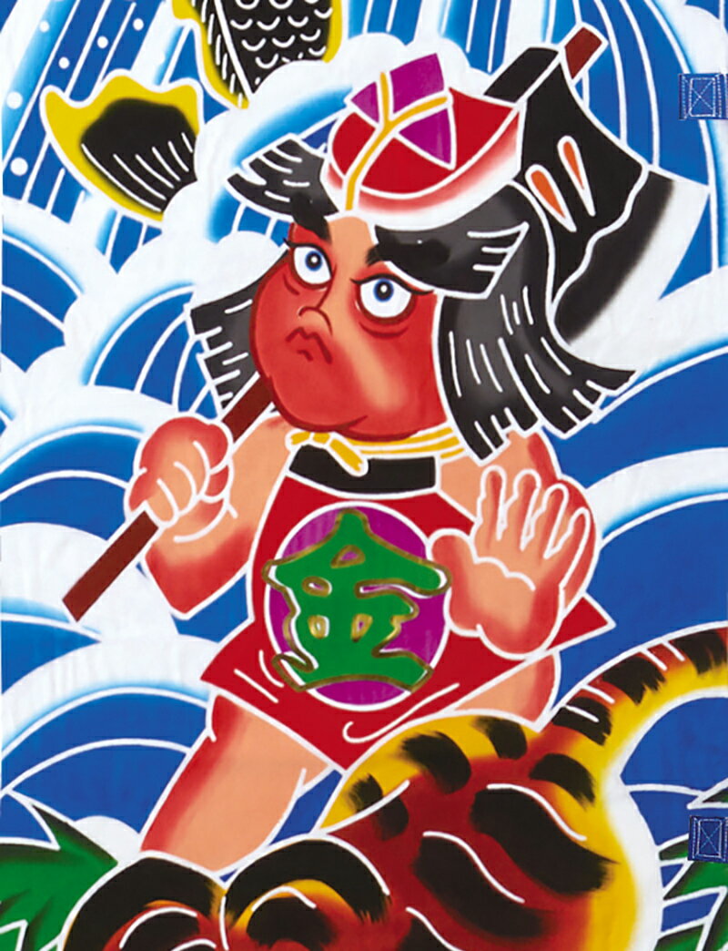 金太郎は長じて大江山の酒呑童子を退治した坂田公時の幼名。鯉が滝を昇り龍になったという立身出世の図柄に元気いっぱいの金太郎と虎を組み合わせ、男児が雄々しく成長する願いを託した幟です。