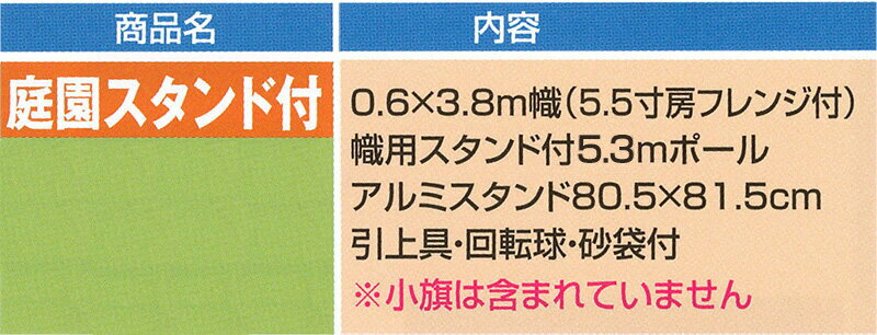 セット内容:0.6×3.8m幟(5.5寸房フレンジ付き) 幟用スタンド付5.3mポール アルミスタンド80.5×81.5cm 引上具 回転球 砂袋