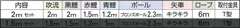 セット内容:吹流2m 黒鯉2m 赤鯉1.5m 青鯉1.2m ポール2.3m キラキラ矢車 ロープ6m T型取付金具