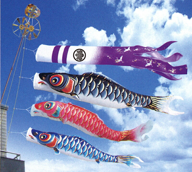吹流しには金色の鶴が舞う、お節句のお祝いに相応しい豪華な鯉のぼりです。