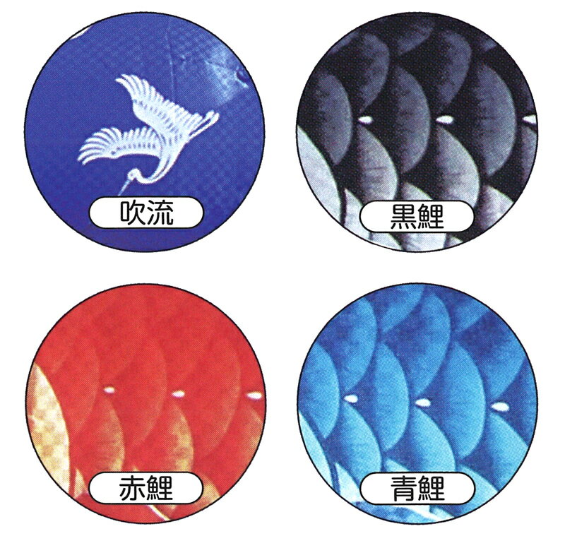 ・商品サイズにより目の描き方、ウロコの形状、ヒレの有無など、細かい仕様が変わります。こいのぼりの細かいほつれや、色むら、樹脂のメッキはげ(矢車の十字部分)等の、生産工程上生じるものは仕様であり不具合ではございませんので、予めご了承の上ご注文ください。