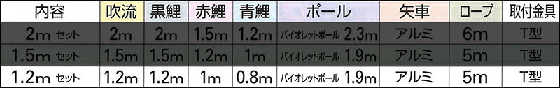 セット内容:吹流1.2m 黒鯉1.2m 赤鯉1m 青鯉0.8m ポール1.9m アルミ矢車 ロープ5m T型取付金具