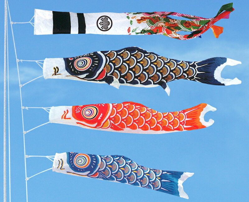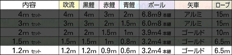 セット内容:吹流1.2m 黒鯉1.2m 赤鯉0.9m 青鯉0.6m ポール3.2m4本継 ゴールド矢車 ロープ6.5m