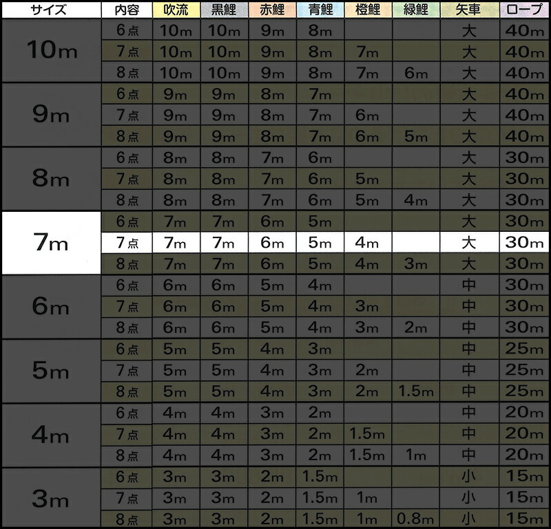 セット内容:吹流7m 黒鯉7m 赤鯉6m 青鯉5m 橙鯉4m 矢車 ロープ30m