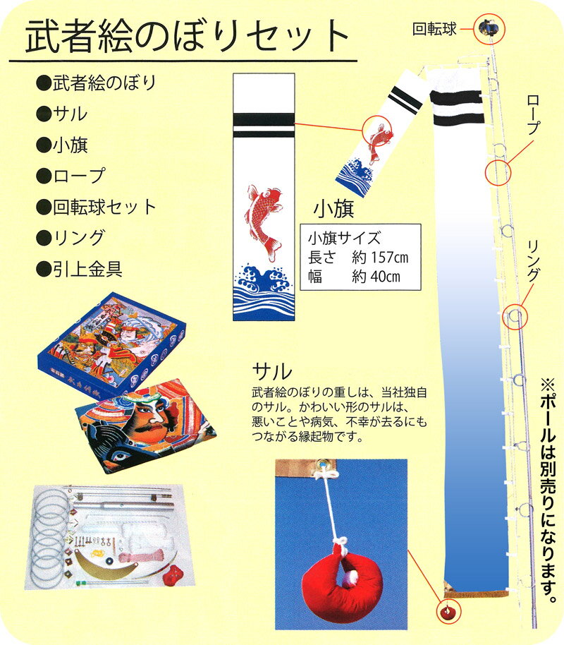セット内容:武者絵のぼり90cm巾(Y巾)×7.5m フレンジ付 サル 小旗 ロープ 回転球セット リング 引上げ金具