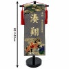 多色細密総刺繍ならではの表現力が、これまでの商品とは一線を画す本格的な刺繍絵名前旗です。飛躍を意味する跳ね馬や長寿を象徴する松などが、細やかに表現されています。吉祥柄として知られる紗綾形と瑞雲が織り込まれた地紋も美しいですね。兜や鎧の脇に飾れば、一層豪華なお節句のお祝いに。お名前と生年月日を、豪華な印象のシャンパンゴールド色の糸刺繍でお入れいたします。スタンドが付属します。