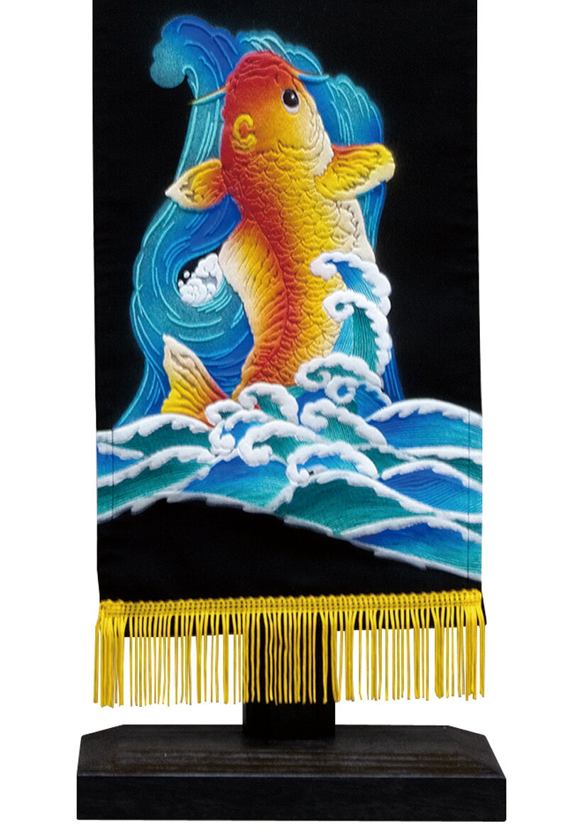 インパクトのある手描き総盛上げ仕上げで、滝を登る鯉が描かれています。