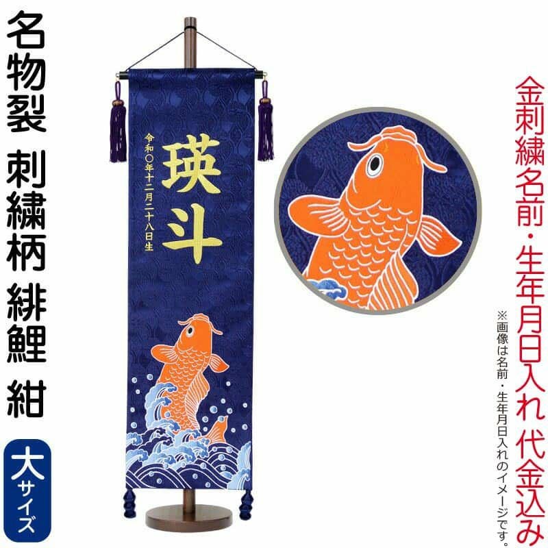 【送料無料】最安値に挑戦!2026年度新作 五月人形 五月人形 こいのぼり 名前旗 村上鯉 室内飾り 名物裂(大)刺繍柄緋鯉 紺 紺房 スタンド付 金糸刺繍 生年月日 名前入れ代込 【2026年度新作】 mk-name5-180-169