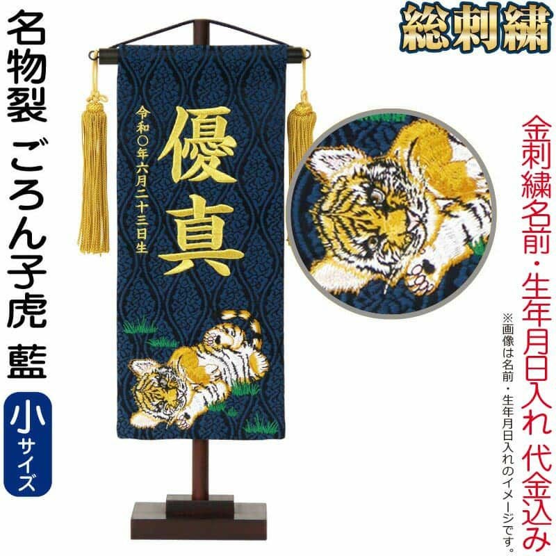 【送料無料】最安値に挑戦!2026年度新作 五月人形 五月人形 こいのぼり 名前旗 村上鯉 室内飾り 名物裂(小)ごろん子虎 藍 金房 スタンド付 金糸刺繍 生年月日 名前入れ代込 【2026年度新作】 mk-name5-207-415