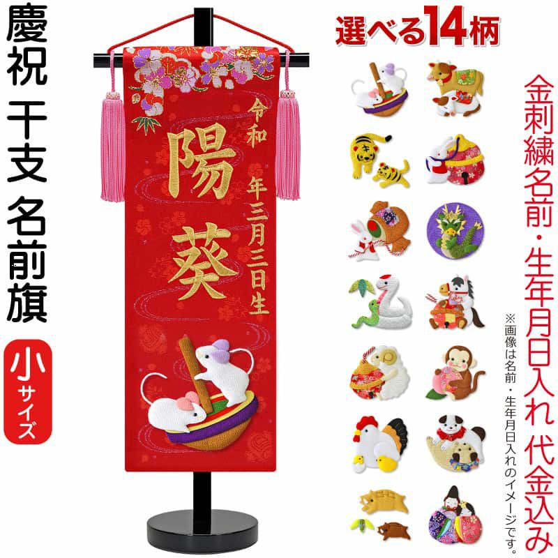 【送料無料】最安値に挑戦!2026年度新作 雛人形 雛人形 ひな人形 名前旗 女の子 慶祝 干支 赤(小)金刺繍 生年月日 名前入れ代金込み 金襴 縮緬 スタンド付 【選べる14種類】 3ad-eto-s-r