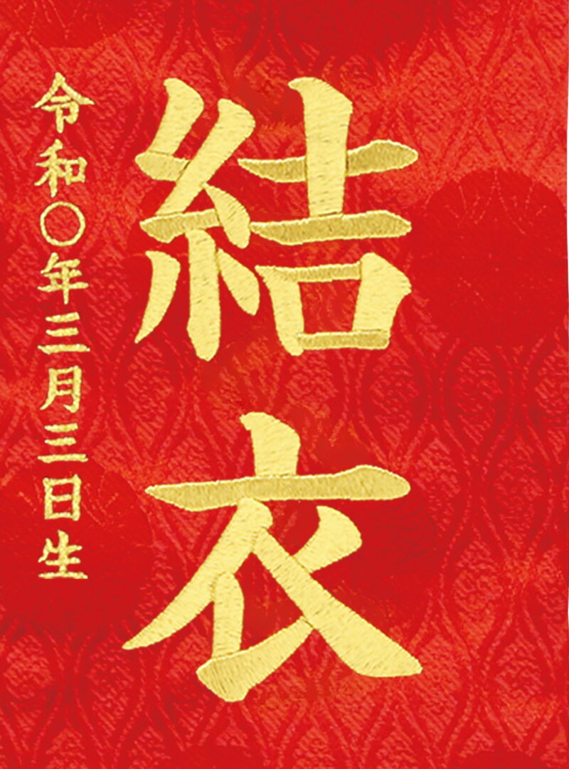 お子様のお名前と生年月日を、豪華な金糸刺繍でお入れします。