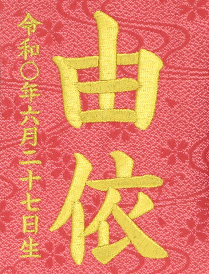 お子様のお名前と生年月日を、豪華な金糸刺繍でお入れします。