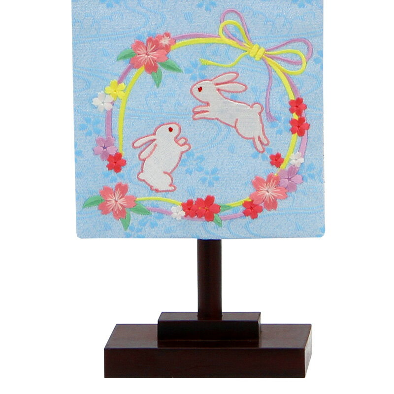 桜柄の地紋が印象的な華やかな生地に、カラフルな桜と飛び跳ねるウサギの刺繍が施されています。かわいらしく元気に育ってほしいと願いを込めて飾るお節句飾りにぴったりの一品です。